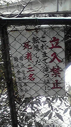 27368219.jpg渓谷入り口にヤバい注意看板あり! 真冬の川は冷たかろうなあ。沖縄の水温と訳が違うし、三人目になりたくないからさ、Uターンして山鹿の街に戻った訳さあ。はあ、もうでーじ!!