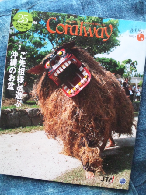 投稿日: 2010-07-15 投稿者: tarukenCoralway 129号 「沖縄発日本の翼」日本トランスオーシャン航空機内誌『Coralway』は、1985年の南西航空時代から8月で創刊25年になります。 今回の特集は「ご先祖様と遊ぶ沖縄のお盆」、波照間島のムシャーマ、平敷屋エイサーです。 25周年の感謝プレゼントがたくさんありますよ~。 「Coralway」は、沖縄県内のコンビニでも、売ってますよ~~。