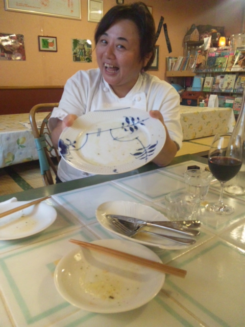 投稿日: 2010-07-29 投稿者: tarukenタルミシュラン 那覇牧志公設市場近くにあるイタリア系料理店『てだこ亭』のオーナーシェフみどりちゃん。開店11年にして3回目の入店で、おじぃ行きつけの店として、堂々の星みっつ!です。 写真を撮る間もなく、ぺろりと完食やっさあ。