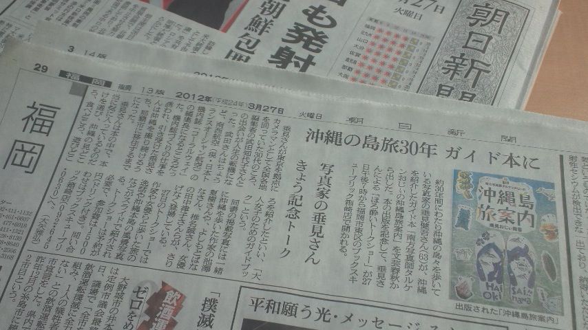 投稿日: 2012-03-27 投稿者: tarukenトーク&スライドショー 「南方写真師タルケンおじぃの沖縄島旅案内」 明日全国発売記念トーク&スライドショー、 本日27日午後7時より、 博多のbooks cafe「キューブリック箱崎店」(092-645-0630)にて行います。 近くの方々どーぞ遊びに来てね~。